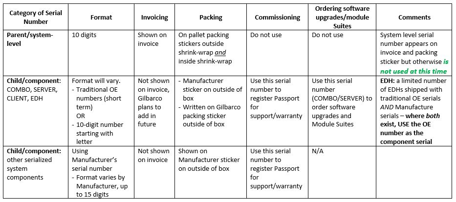 The Child/component serial number – as before – will be the serial number you will use for tracking Passport and for registering the system for warranty and support purposes. You will use the Child/component serial number for the COMBO/SERVER to place orders for software upgrades, completion software for un-imaged volume systems and for subsequent purchase of Modules Suites. This serial number is not currently provided to you on the invoice, but we are working to add at least the COMBO/SERVER/CLIENT/EDH serials to the invoice in the future. In the meantime, if you need a listing of child/component serials for your order, please contact the PSO Contract Services Team, gvr.gso.ser.commissionings@gilbarco.com or amy.wilson@gilbarco.com.