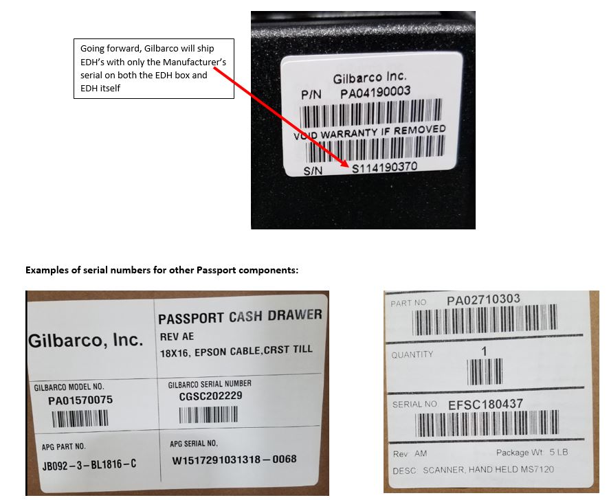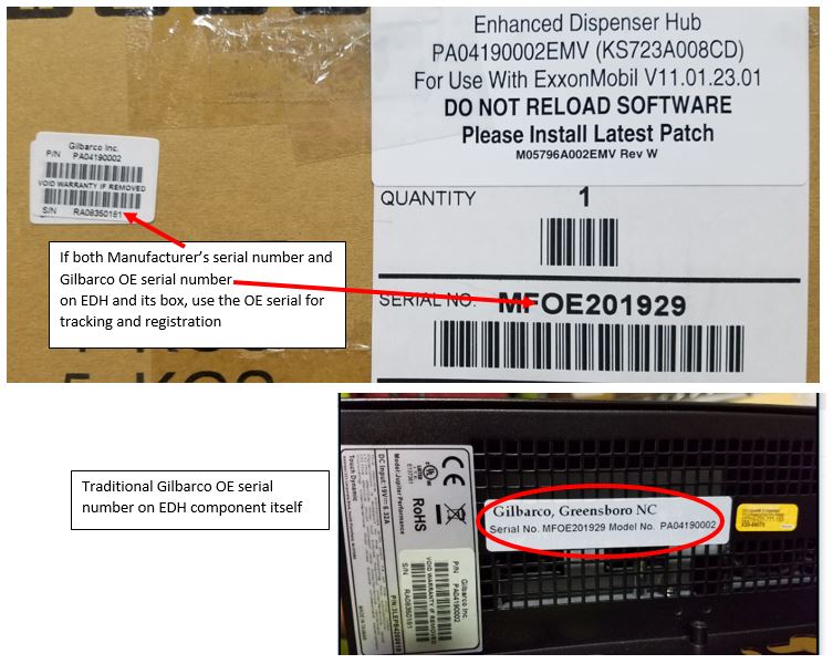 - Some EDHs shipped in early 2018 show both a Manufacturer’s serial number and a traditional Gilbarco OE serial number. If you receive one of those EDHs, please use the Gilbarco OE serial number for your tracking and registration of the system for warranty/support. Shortly, Gilbarco will be shipping EDHs with only a Manufacturer’s 10-digit serial number. At that time, you will use that serial for tracking and registration.